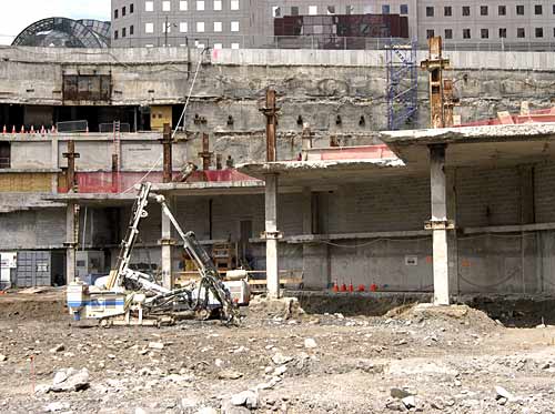 在建筑工地的西北角不是这样,在斜坡的正前方,有大约20名建筑工人正在往下面的岩床挖掘,为新建的“自由塔”打基础。工人们还拆除“双子塔”旧的停车库的残留物,包一排大钉似的钢筋和十字形的圆柱残留物;拆除旧的下水管道作为废料出售,在火车轨道之间重新部署公共设施,为建筑物的基础留出更多的空间;准备覆盖爆破点的编织金属毯;将废弃的泥土、金属和混凝土倾倒入载重卡车。